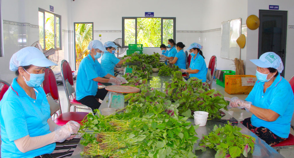 Công nhân Hợp tác xã Rau an toàn Phước Hòa (huyện Cần Đước) sơ chế rau trước khi cung cấp cho các siêu thị, bếp ăn tập thể