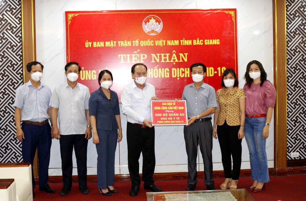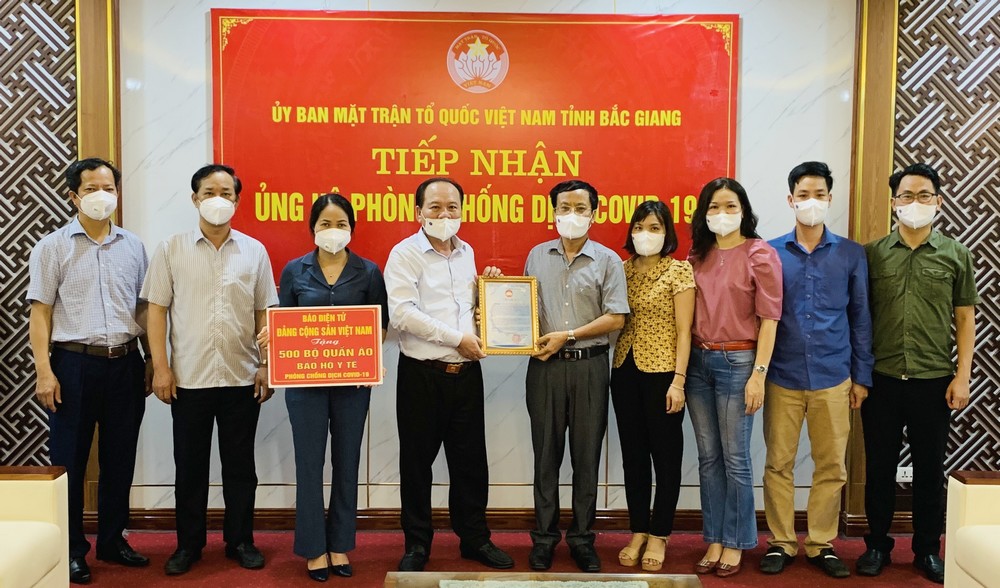 Chia sẻ với những khó khăn của tỉnh Bắc Giang, thay mặt Công đoàn Báo điện tử Đảng Cộng sản Việt Nam, đồng chí Nguyễn Văn Minh, Chủ tịch Công đoàn Báo cho biết, trong thời gian qua, cùng với nhân dân cả nước, cán bộ, phóng viên, đoàn viên của Báo đã tích cực tham gia hưởng ứng các hoạt động hỗ trợ công tác phòng, chống COVID-19 của cả nước nói chung và đồng hành cùng Bắc Giang nói riêng. Báo đã tích cực tuyên truyền những chủ trương, chính sách của Đảng, Nhà nước; công tác chỉ đạo của lãnh đạo Đảng, Nhà nước nói chung và của Bắc Giang nói riêng trong công tác phòng, chống COVID-19; những hình ảnh xúc động, chịu đựng nhiều gian khổ để hoàn thành tốt mọi nhiệm vụ của các lực lượng tuyến đầu từ tâm dịch và những hoạt động nghĩa tình của cả nước đối với Bắc Giang…. Đồng chí Nguyễn Văn Minh cho biết, thông qua MTTQ Việt Nam tỉnh Bắc Giang, cùng với sự chung sức, đồng lòng của cả nước, món quà 500 bộ quần áo bảo hộ y tế cao cấp sẽ góp phần chia sẻ cùng tỉnh những khó khăn trước mắt.