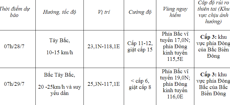 Theo Trung tâm Dự báo Khí tượng thủy văn quốc gia, vào hồi 07 giờ, vị trí tâm bão ở vào khoảng 20,5 độ Vĩ Bắc; 119,8 độ Kinh Đông. Sức gió mạnh nhất vùng gần tâm bão mạnh cấp 13-14 (134-166km/giờ), giật cấp 17.