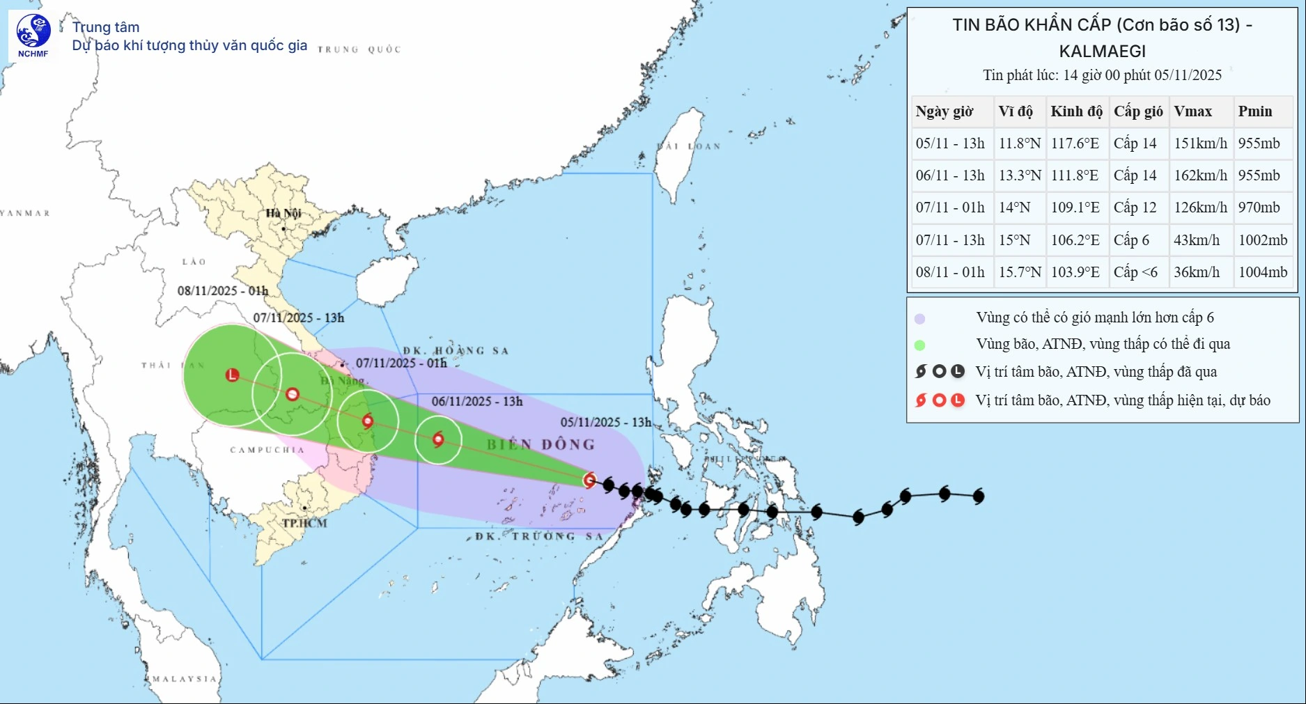 Theo Trung tâm Dự báo khí tượng thủy văn quốc gia (NCHMF), lúc 13 giờ hôm nay (05/11), vị trí tâm bão Kalmaegi (số 13) khoảng 11,8 độ vĩ bắc và 117,6 độ kinh đông, cách đảo Song Tử Tây (thuộc đặc khu Trường Sa) khoảng 360 km về phía đông.
