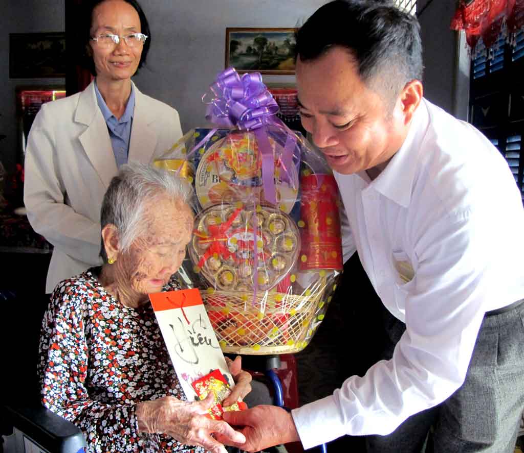 Tổng Biên tập Báo Long An - Lê Công Đấu tặng quà cho Mẹ Việt Nam Anh hùng- Nguyễn Thị Bông (98 tuổi), ấp Bình Hòa.