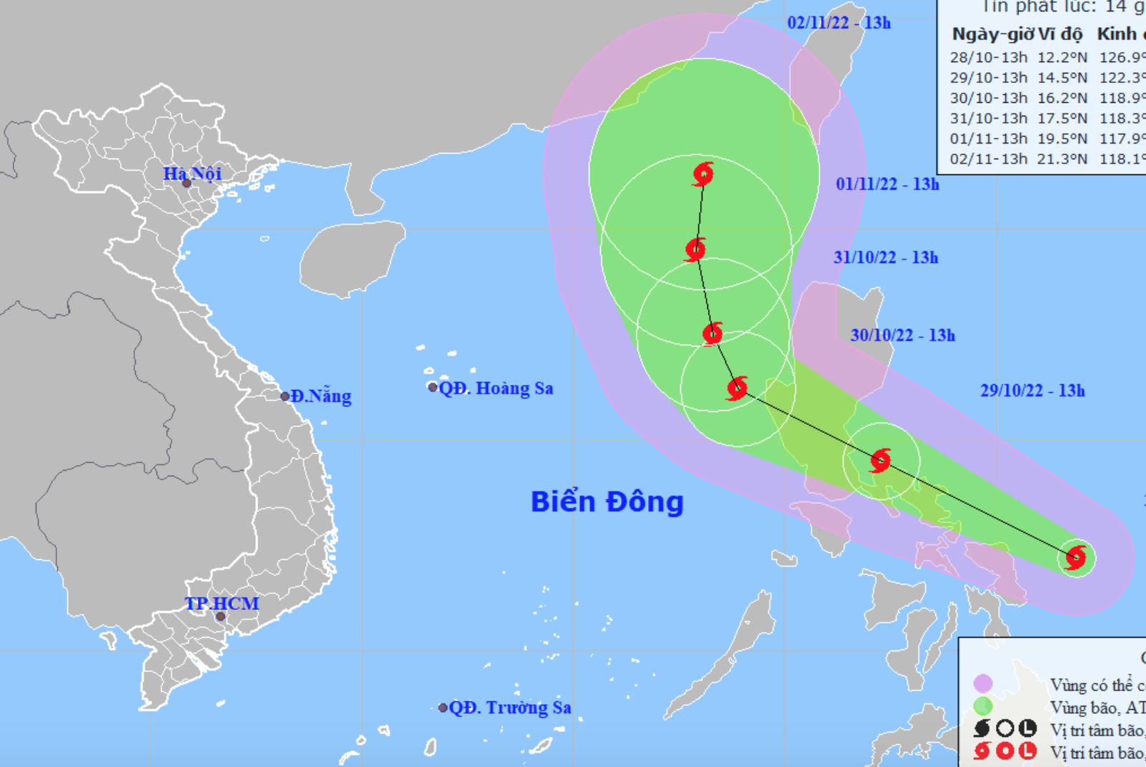 Hồi 1 giờ ngày 29/10, vị trí tâm bão ở vào khoảng 13,6 độ Vĩ Bắc; 124,3 độ Kinh Đông, trên vùng biển phía Đông miền Trung Philippines. Sức gió mạnh nhất vùng gần tâm bão mạnh cấp 9 - 10 (75 - 102 km/giờ), giật cấp 12.