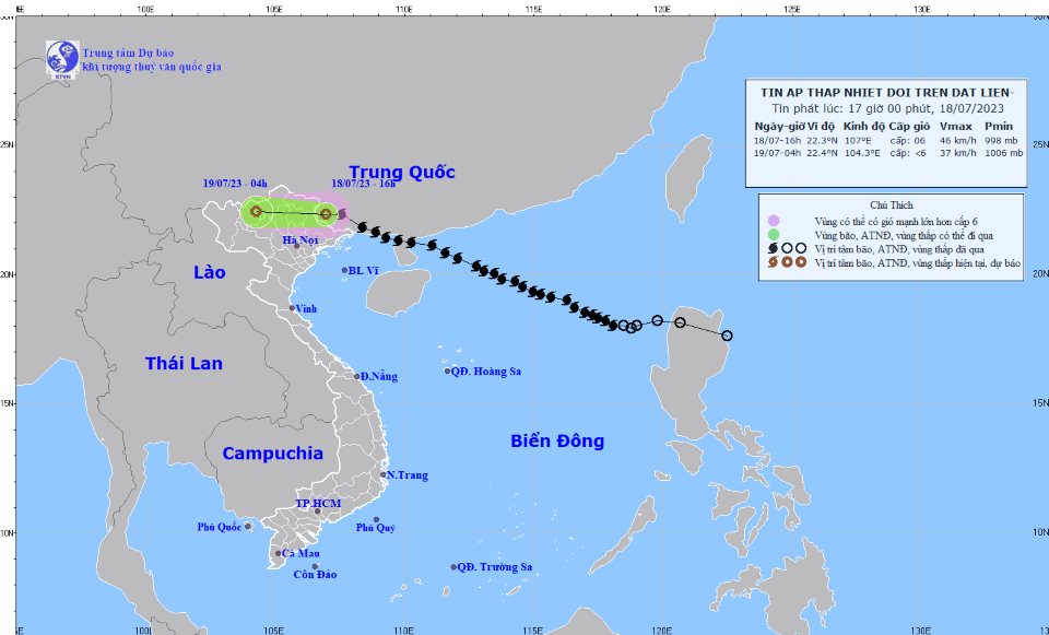 Theo Trung tâm Dự báo khí tượng thủy văn Quốc gia, hồi 16 giờ ngày 18-7, vị trí tâm áp thấp nhiệt đới ở vào khoảng 22,3 độ vĩ bắc; 107,0 độ kinh đông, trên đất liền khu vực phía tây nam tỉnh Quảng Tây (Trung Quốc). Sức gió mạnh nhất vùng gần tâm áp thấp nhiệt đới mạnh cấp 6 (39-49 km/giờ), giật cấp 8.