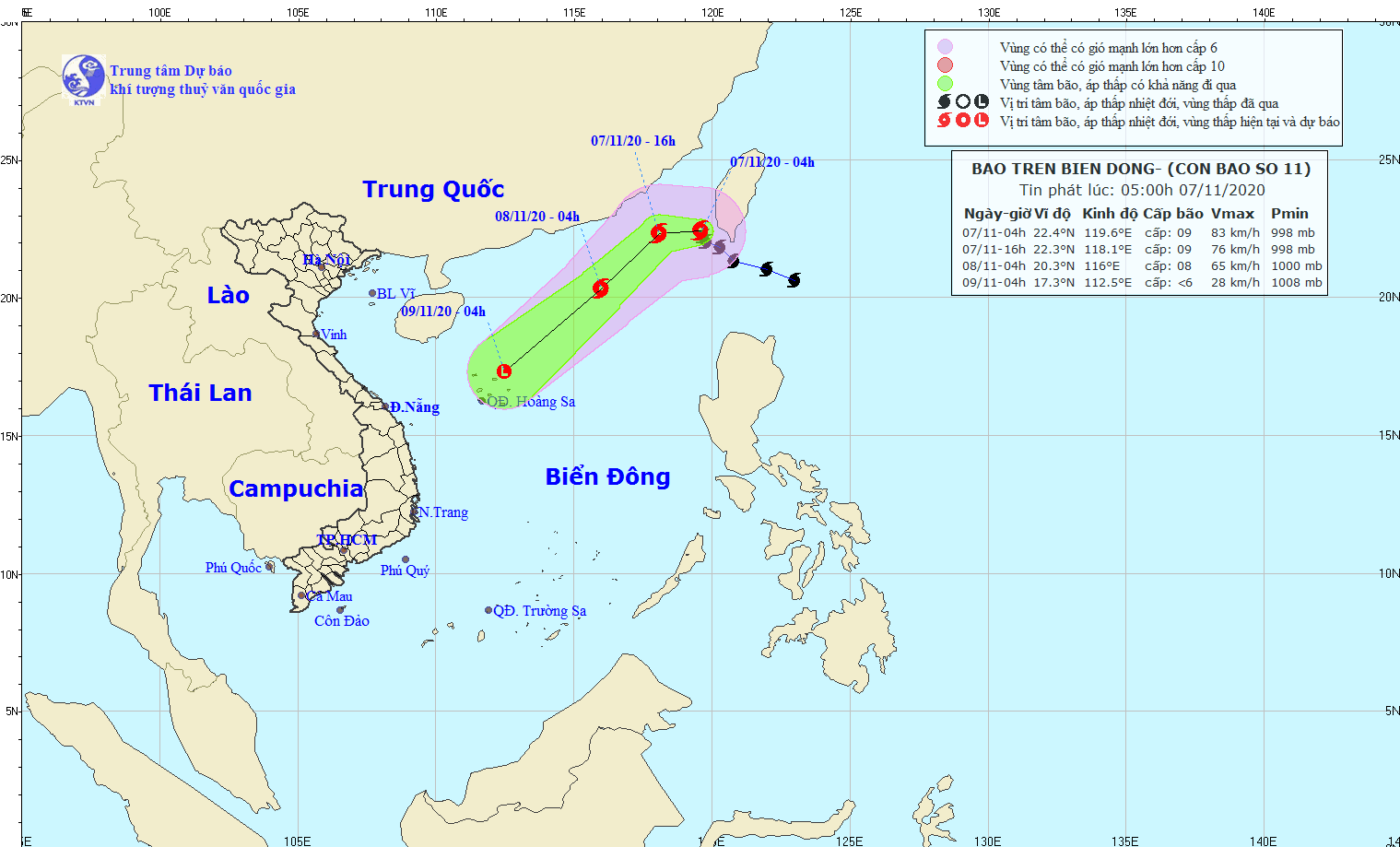 Dự báo trong 12 giờ tới, bão di chuyển theo hướng Tây, mỗi giờ đi được khoảng 10km. Đến 16 giờ ngày 07/11, vị trí tâm bão ở khoảng 22,3 độ Vĩ Bắc; 118,1 độ Kinh Đông, cách đảo Đài Loan khoảng 220km về phía Tây Tây Nam. Sức gió mạnh nhất vùng gần tâm bão mạnh cấp 8-9 (60-90km/giờ), giật trên cấp 11.