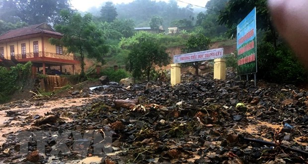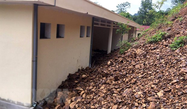 Mưa bão gây sạt lở đất vào tới tận trường Tiểu học xã Trung Lý, huyện biên giới Mường Lát. (Ảnh: Nguyễn Nam/TTXVN)