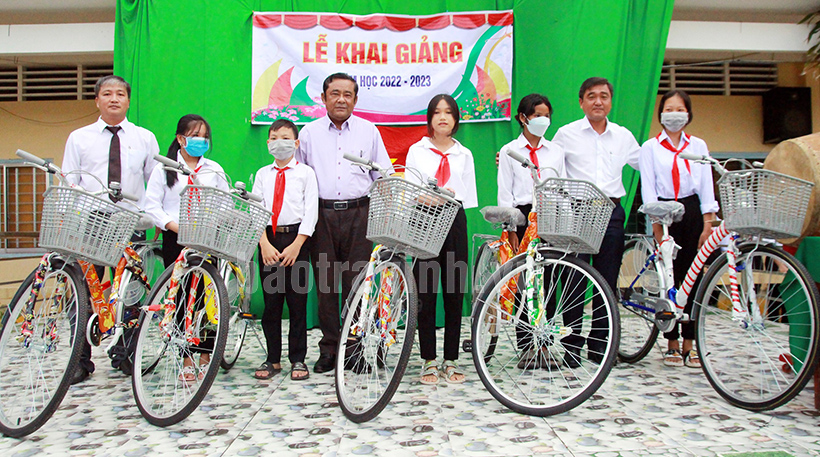 Tặng xe đạp cho học sinh nghèo, hiếu học Trường THCS An Trường A, xã An Trường A, huyện Càng Long trong ngày khai giảng năm học 2022 - 2023.