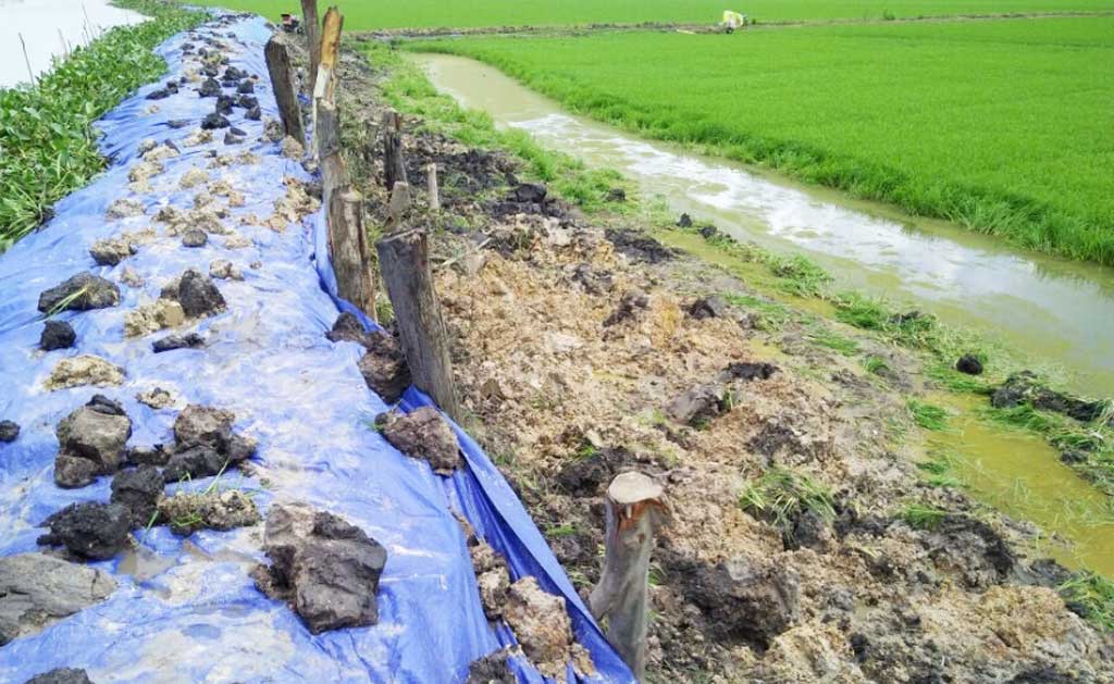 Thi công gia cố đê bao bảo vệ lúa trước tình hình mưa, lũ