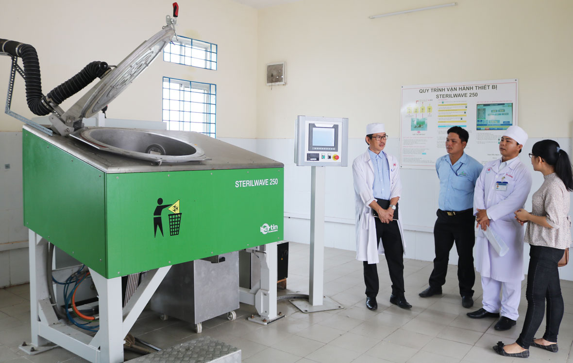 Đưa chúng tôi đi tham quan hệ thống xử lý chất thải y tế của BV, Trưởng khoa Kiểm soát nhiễm khuẩn, BV ĐKKV Hậu Nghĩa - dược sĩ Trương Thành Giăng chia sẻ: “Chất thải lây nhiễm của BV trên 14.900kg/năm. Trước đây, công tác xử lý chất thải y tế gặp khó khăn do công nghệ xử lý lạc hậu, công suất cũng như chất lượng chất thải sau xử lý chưa triệt để. Hiện BV được đầu tư hệ thống xử lý chất thải lây nhiễm bằng công nghệ vi sóng kết hợp nghiền cắt - Sterilwave 240 giúp xử lý chất thải bảo đảm theo quy định, không gây ô nhiễm môi trường”.