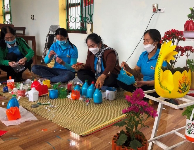 | Đồ tái chế được hội viên, phụ nữ Thanh Hóa tận dụng thành những vật dụng hữu ích (bình hoa, chậu hoa...) |