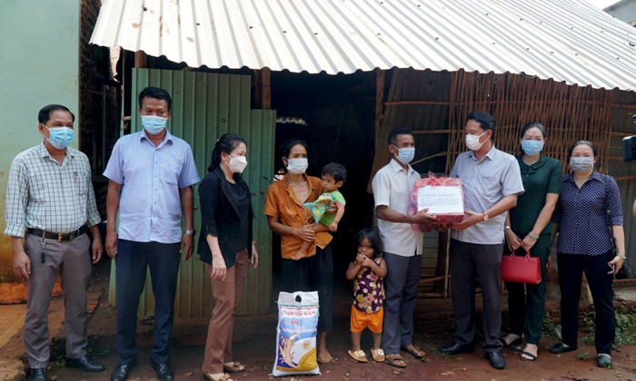 | Ban Dân tộc tỉnh Bình Phước tặng quà cho hộ có hoàn cảnh khó khăn chịu ảnh hưởng của dịch bệnh COVID-19 ở huyện Hớn Quản (Ảnh: Lâm Á Rịa) |