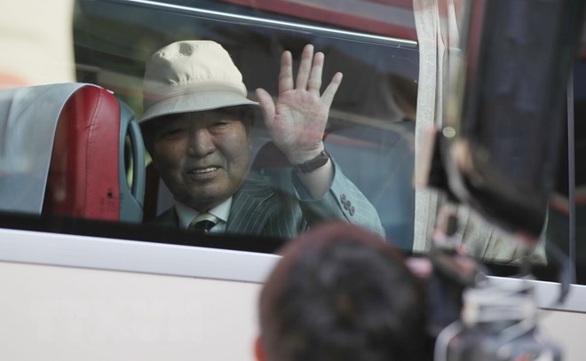 Đoàn xe chở người cao tuổi Hàn Quốc rời Sokcho để tới núi Kumgang trên lãnh thổ Triều Tiên ngày 20/8. (Ảnh: Yonhap/TTXVN)