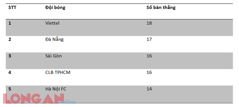Theo sau Viettel là Đà Nẵng với 17 bàn và Sài Gòn FC với 16 bàn. Đáng ngạc nhiên là ĐKVĐ Hà Nội FC mới chỉ có 14 bàn sau 10 trận và đã có 2 trận họ không thể chọc thủng lưới đối phương.