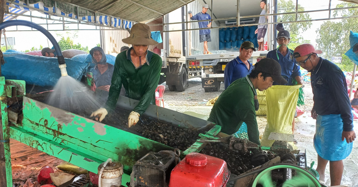 Theo anh Cường, cứ chiều đến, vợ chồng anh bơi xuồng đi bắt ốc đến gần sáng mới về, được khoảng 200-400kg. Với giá bán cho thương lái từ 1.300-1.500 đồng/kg (ốc còn vỏ), anh kiếm được từ 300.000-400.000 đồng. Những đêm mưa nhiều, lượng ốc bắt được ít hơn.