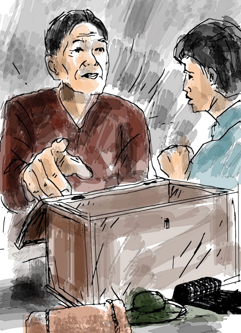 Anh hai khệ nệ bưng chiếc rương từ trong tủ ra để giữa nhà. Chiếc rương bị bao phủ một lớp bụi xám xịt. Anh hai tôi phủi bụi và tìm cách mở móc khóa. Nắp rương được bật ra, tôi nhận ra manh đệm bàng được xếp cẩn thận vuông vắn, bên trên là chiếc khăn rằn màu trắng đen đã thẫm màu, chỉ còn có thể nhận ra những ô vuông trắng đen phủ màu vàng đục. Anh hai tôi cẩn thận lôi ra từng món, sợ rệu rã trước ánh nắng. Anh nói:
