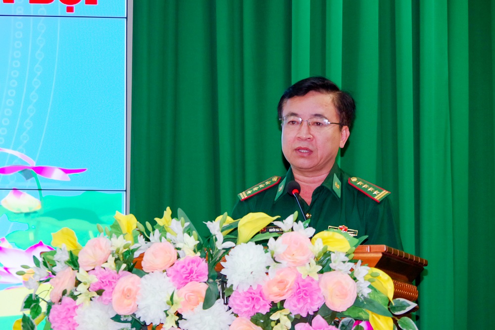 | Đại tá Nguyễn Trìu Mến, Tỉnh ủy viên, Bí thư Đảng ủy, Chính ủy BĐBP tỉnh Sóc Trăng phát biểu tại buổi gặp mặt. |