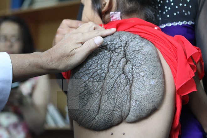 Bé gái Trần Thị Ngọc Thắm (10 tuổi, ngụ Sóc Trăng) mang khối bướu khổng lồ trên lưng. (Ảnh: Phương Vy/TTXVN)