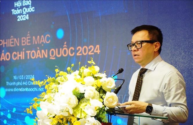 | Đồng chí Lê Quốc Minh, Tổng biên tập Báo Nhân Dân, Phó trưởng Ban Tuyên giáo Trung ương, Chủ tịch Hội Nhà báo Việt Nam phát biểu bế mạc. (Ảnh: TTXVN) |