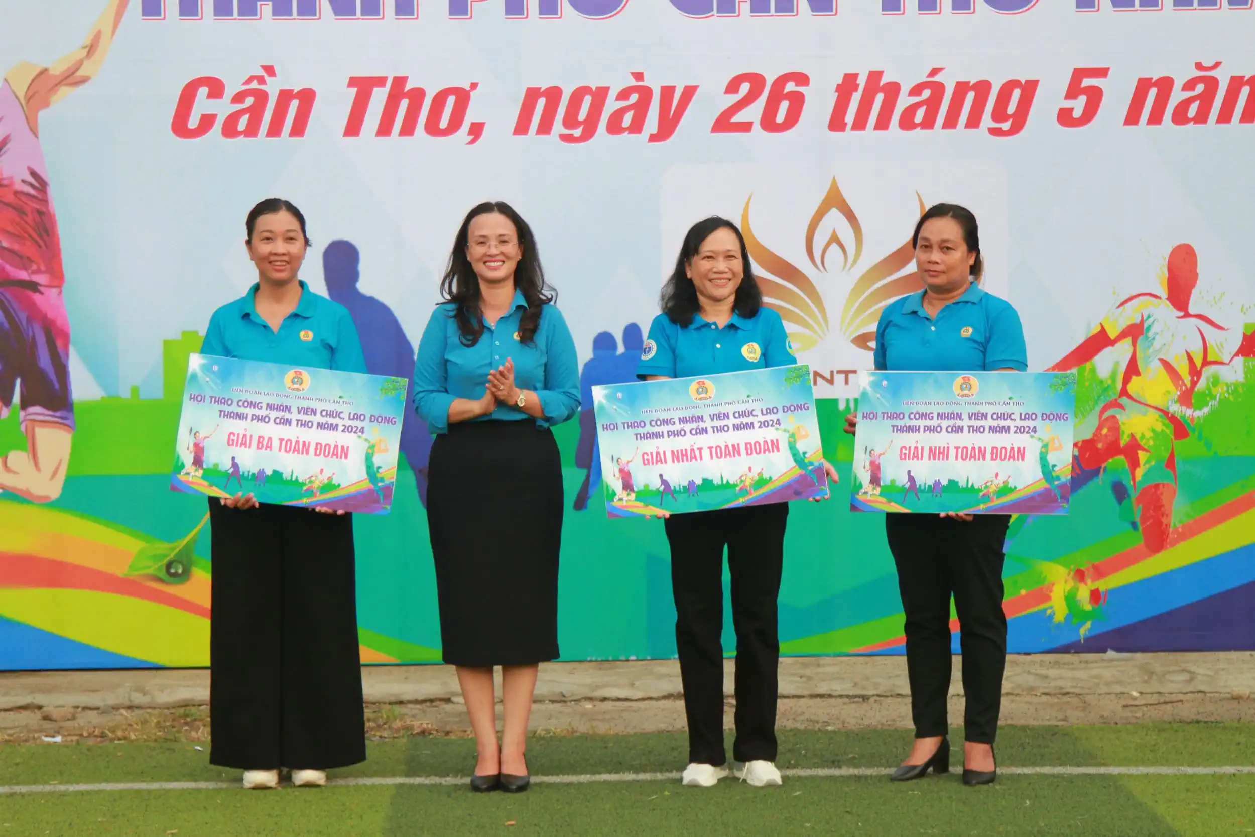 Bà Lê Thị Sương Mai, Chủ tịch LĐLĐ TP Cần Thơ, trao giải toàn đoàn đến các đơn vị.
