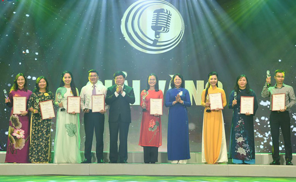 Phó Chủ tịch nước - Đặng Thị Ngọc Thịnh và Tổng Giám đốc VOV - Nguyễn Thế Kỷ trao giải Vàng cho các tác giả, tác phẩm đoạt giải ở thể loại Chương trình Phát thanh trực tiếp. Nguồn VOV