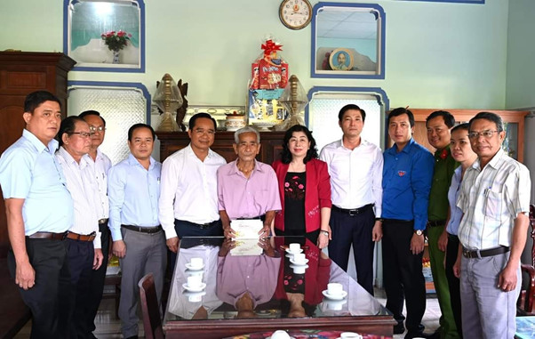 Bí thư Huyện ủy Bến Lức - Nguyễn Đăng Minh Xuân (bìa trái) và Đoàn cán bộ đến thăm, tặng quà cho người có công trên địa bàn huyện