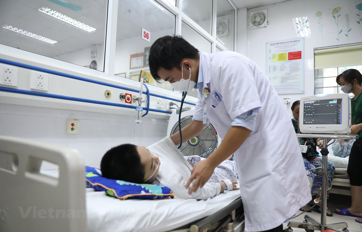 Bác sỹ tại Bệnh viện Xanh Pôn khám cho một bệnh nhi mắc sốt xuất huyết trong tình trạng nặng. (Ảnh: PV/Vietnam+)
