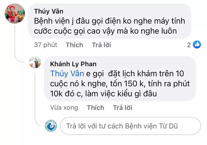 Hai trong số các comment phản ánh của bệnh nhân vì lầm tưởng các đầu số nói trên là của Bệnh viện Từ Dũ. Nhờ các phản ánh này, Bệnh viện Từ Dũ đã tìm hiểu và biết được về các tổng đài mạo danh (Ảnh: Facebook Bệnh viện Từ Dũ)