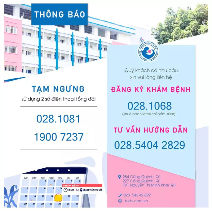 Bệnh viện Từ Dũ khuyến cáo người dân khi cần tìm hiểu thông tin về bệnh viện, về các dịch vụ khám chữa bệnh, nên gọi trực tiếp đến số 028.5404 2829 hoặc tìm hiểu thông tin trên website chính thức của bệnh viện (tudu.com.vn) hay Fanpage trên Facebook "Bệnh viện Từ Dũ" (có tick xanh)./.