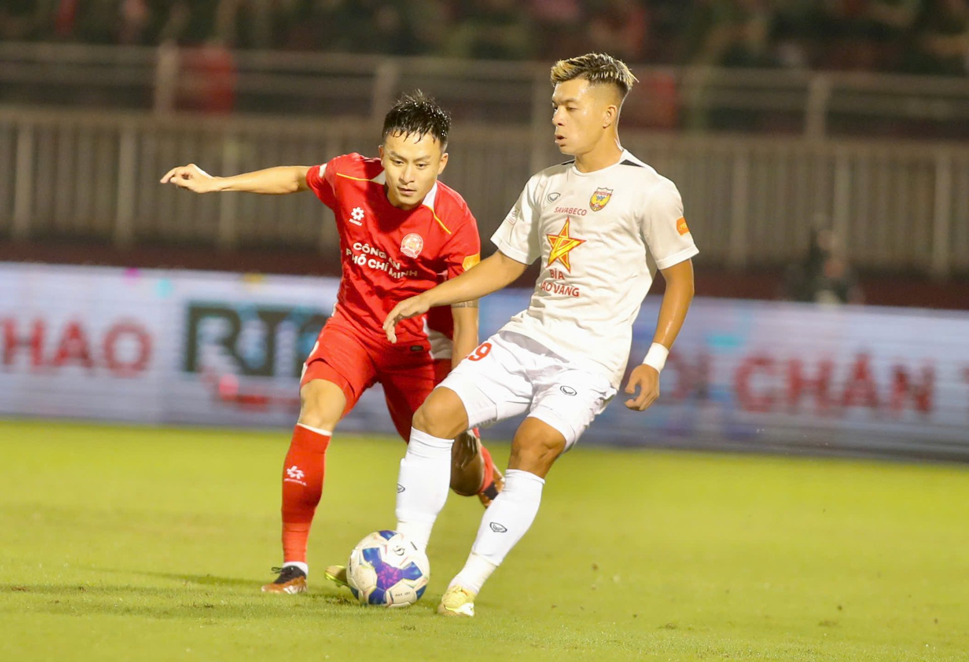 Đức Phú (áo đỏ) và Viktor Lê, hai cầu thủ chơi khá nổi bật của Công an TP Hồ Chí Minh và Hà Tĩnh trong trận này. Ảnh: danviet