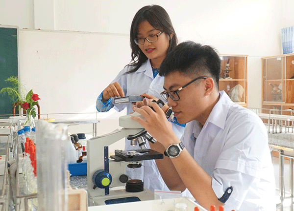 Minh Khang và giáo viên Tổ Sinh học nhà trường thực hành thí nghiệm.