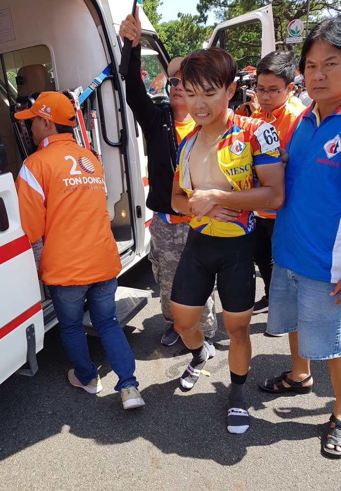 Tay đua Minh Trí được dìu lên xe cấp cứu sau tai nạn. Ảnh: T.P
