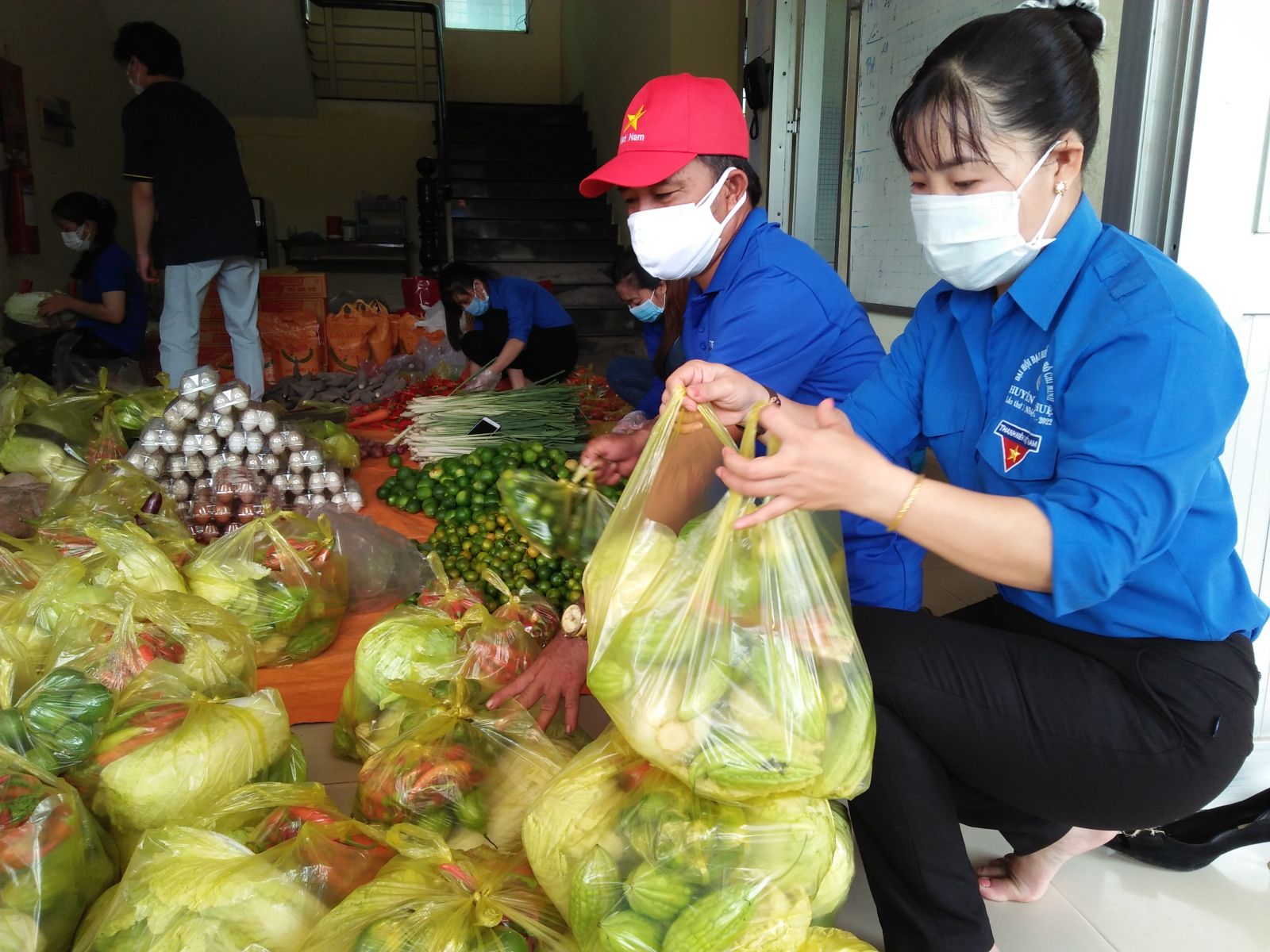Chị Minh Thơ cùng các tình nguyện viên gói thực phẩm để vận chuyển đến các hộ gia đình khó khăn, hộ gia đình bị cách ly, phong tỏa