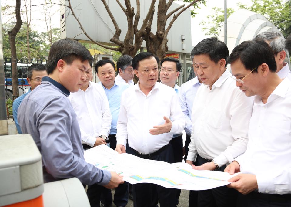 Chiều 4/4, Ủy viên Bộ Chính trị, Bí thư Thành ủy Hà Nội Đinh Tiến Dũng đi kiểm tra tình hình thực hiện Dự án đường Vành đai 1 (đoạn Hoàng Cầu - Voi Phục) trên địa bàn quận Ba Đình và Đống Đa.