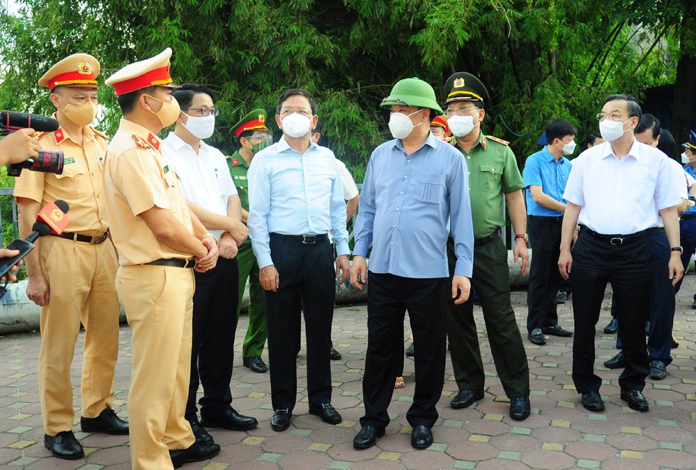 | Bí thư Thành ủy Hà Nội Đinh Tiến Dũng, Chủ tịch UBND TP Hà Nội Chu Ngọc Anh kiểm tra công tác phòng, chống dịch Covid-19 tại chốt Đại lộ Thăng Long. |