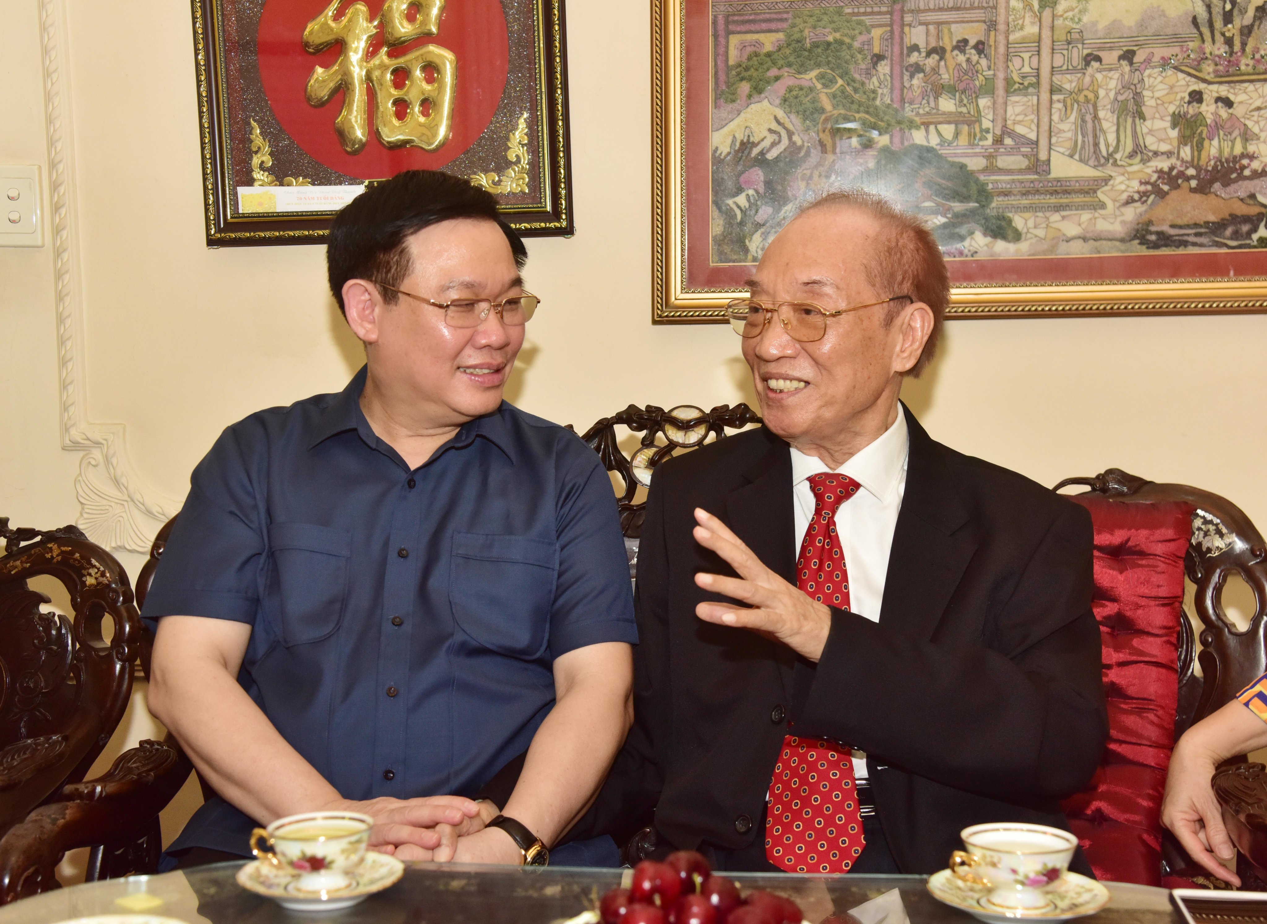 | Bí thư Thành ủy Hà Nội Vương Đình Huệ trò chuyện đồng chí Đoàn Duy Thành. |