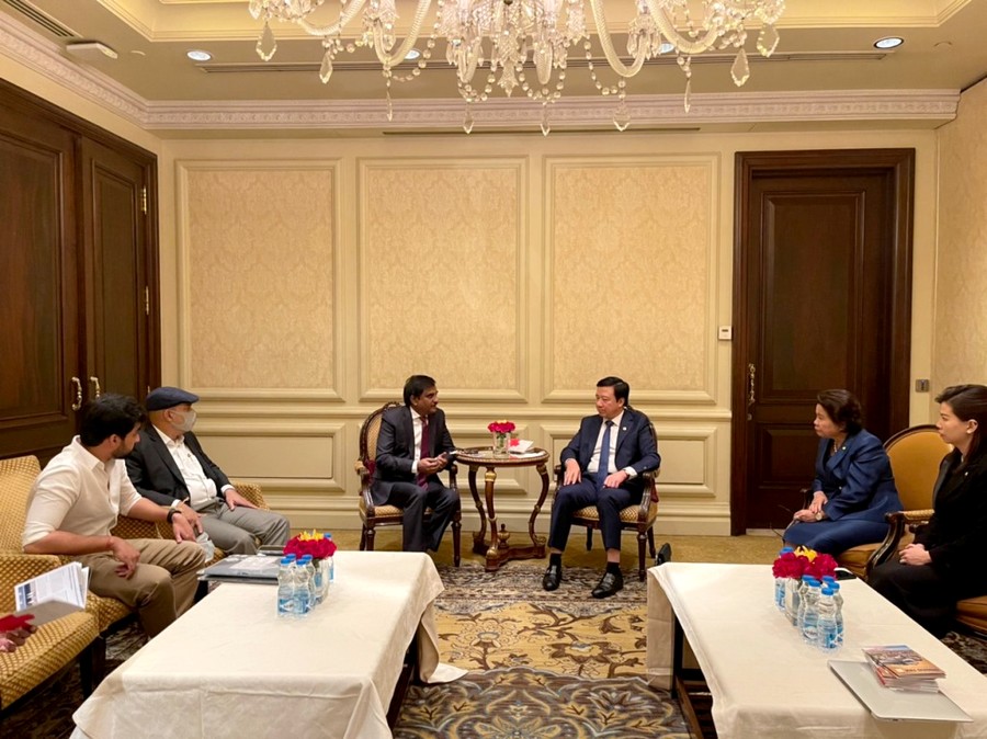 | Đồng chí Phạm Xuân Thăng gặp gỡ, trao đổi xúc tiến đầu tư với lãnh đạo Công ty Sri Avantica Contractor Limited của Ấn Độ. |