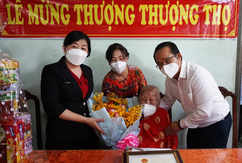 Bí thư Tỉnh ủy, Chủ tịch HĐND tỉnh - Nguyễn Văn Được (bìa phải) và Giám đốc Sở Lao động - Thương binh và Xã hội - Nguyễn Hồng Mai tặng hoa và quà chúc mừng thượng thượng thọ cụ Huỳnh Thị Tốt