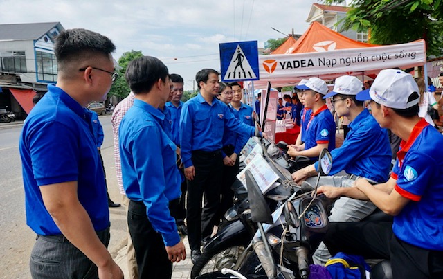 | Bí thư Trung ương Đoàn Ngô Văn Cương (thứ ba từ trái qua) động viên đội Xe ôm tình nguyện tại Thái Nguyên. |