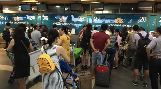Các màn hình chỉ dẫn thông tin tại các quầy làm thủ tục chuyến bay (check-in) của các hãng hàng không ở sân bay Nội Bài chiều 29-7 đều bị tắt - Ảnh: Thân Hoàng