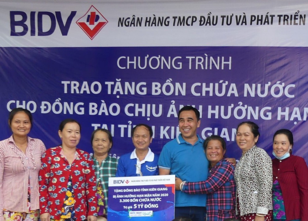 Chương trình “Nước ngọt cho cuộc sống Xanh” năm 2020 được BIDV phát động từ ngày 26/4/04/2020 đến 12/5/2020 với mong muốn gắn kết hàng triệu khách hàng chung tay hỗ trợ đồng bào các tỉnh Đồng bằng sông Cửu Long đang chịu tác động của hạn hán, ngập mặn đến cuộc sống sinh hoạt hàng ngày. Theo đó, tương ứng với mỗi giao dịch chuyển tiền trên kênh BIDV SmartBanking và BIDV Online, BIDV đã trích 5.000 đồng cho chương trình tặng bồn chứa nước, máy lọc nước cho người dân.