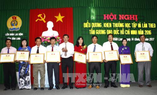 Trong năm 2016, toàn tỉnh Vĩnh Long có 100% công đoàn cơ sở khu vực Nhà nước và 32.058 lượt công nhân, viên chức, lao động đăng ký thực hiện rèn luyện học tập và làm theo tấm gương đạo đức, phong cách của Bác. Qua thực hiện “Học tập và làm theo tấm gương đạo đức Hồ Chí Minh”, năm 2016 toàn tỉnh có 197 tập thể, 748 cá nhân được các cấp ủy đảng biểu dương, khen thưởng.