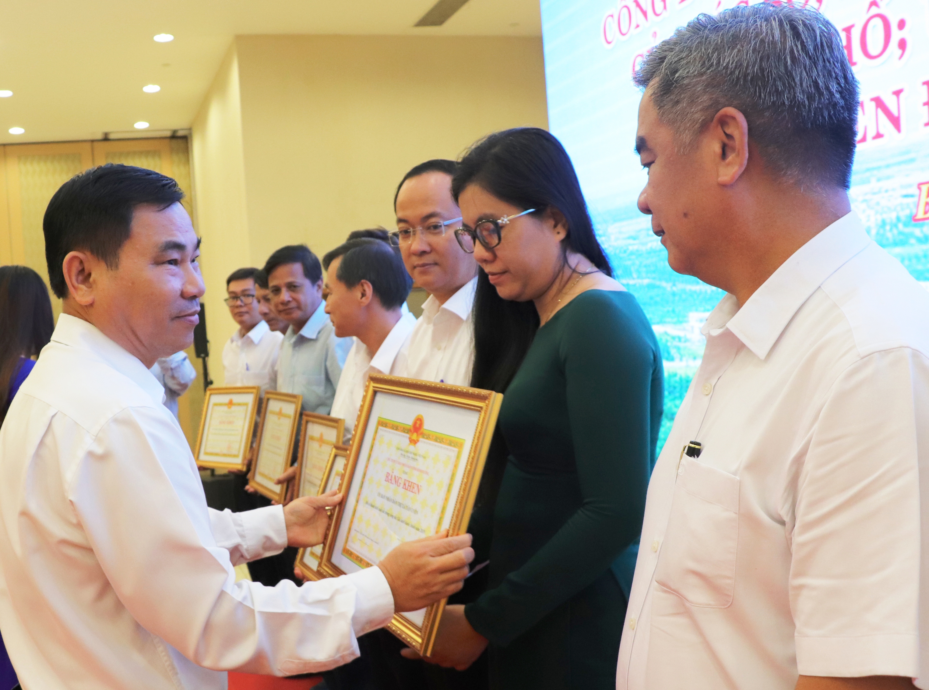 | Ông Nguyễn Văn Minh, Giám đốc Sở Nội vụ trao bằng khen của UBND tỉnh cho các tập thể có thành tích tốt trong công tác CCHC năm 2019. |