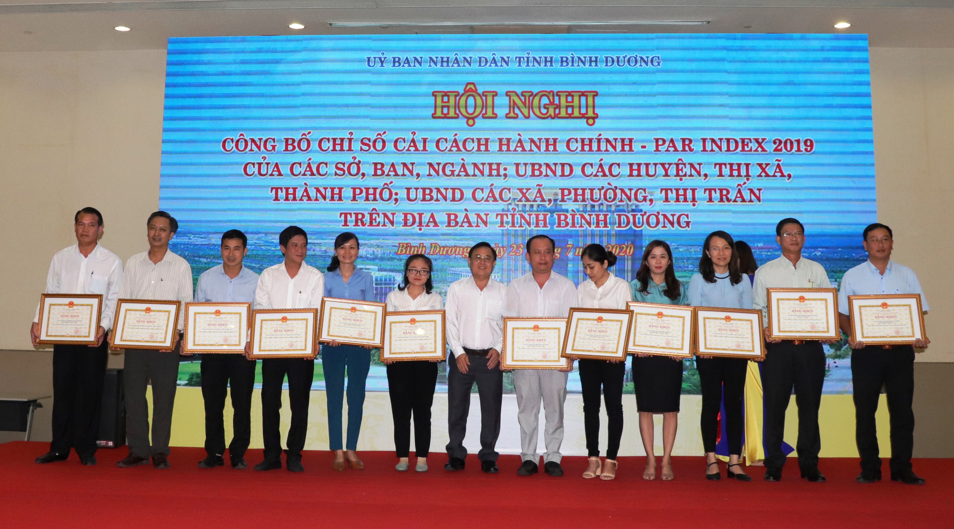 Ngày 23/7, UBND tỉnh Bình Dương tổ chức Hội nghị Công bố kết quả Chỉ số cải cách hành chính (CCHC) năm 2019 của các sở, ban, ngành, UBND các huyện, thị xã, thành phố, UBND các xã, phường, thị trấn trên địa bàn tỉnh. Tại hội nghị, UBND tỉnh Bình Dương đã tổ chức tuyên dương, tặng bằng khen cho 25 tập thể có thành tích tốt trong công tác CCHC năm 2019.