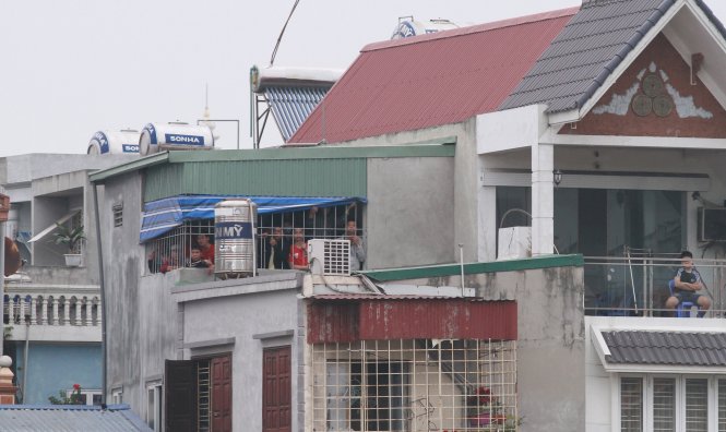 Do sân Lạch Tray bị kỷ luật- không được bán vé- nên người hâm mộ phải theo dõi trận Hải Phòng- Quảng Nam từ những ngôi nhà cao tầng bên cạnh sân. Ảnh: Anh Tuấn