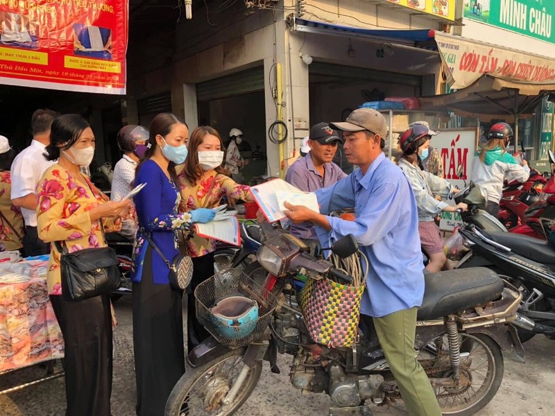 | Hội viên Hội LHPN Bình Dương phát tờ rơi tuyên truyền phòng chống dịch COVID-19. (Ảnh: Báo Bình Dương) |