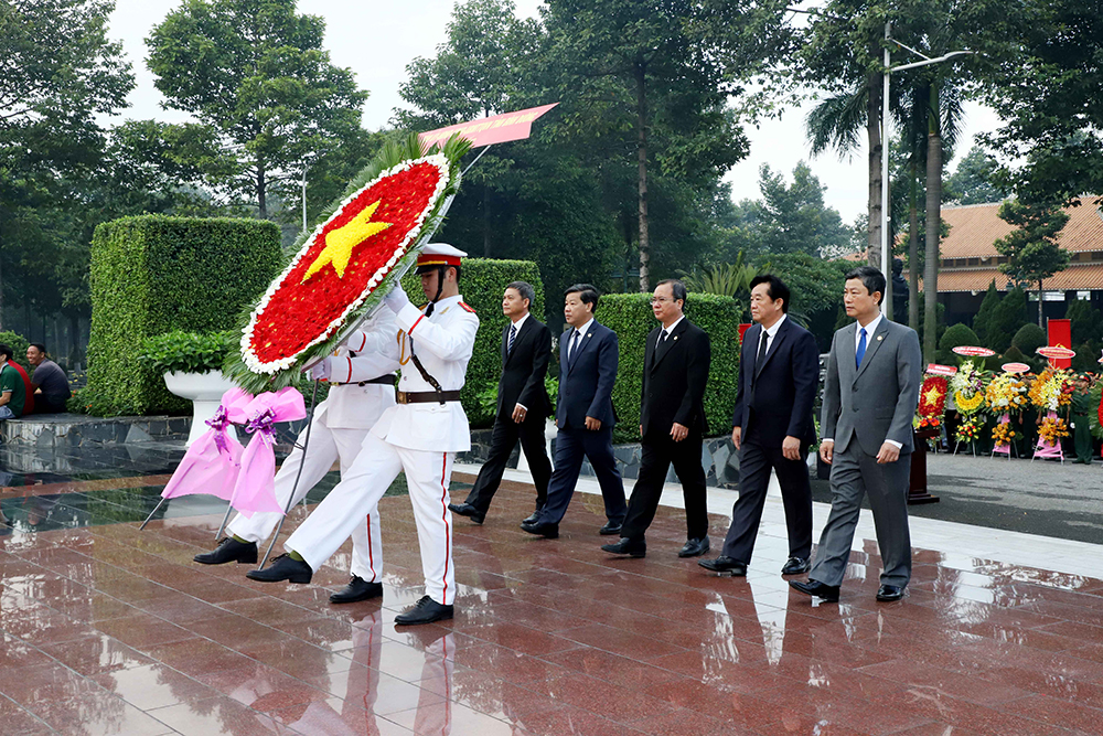 | Các đồng chí lãnh đạo tỉnh Bình Dương dâng hương, dâng hoa tại Nghĩa trang liệt sĩ tỉnh. (Ảnh: Quốc Chiến) |