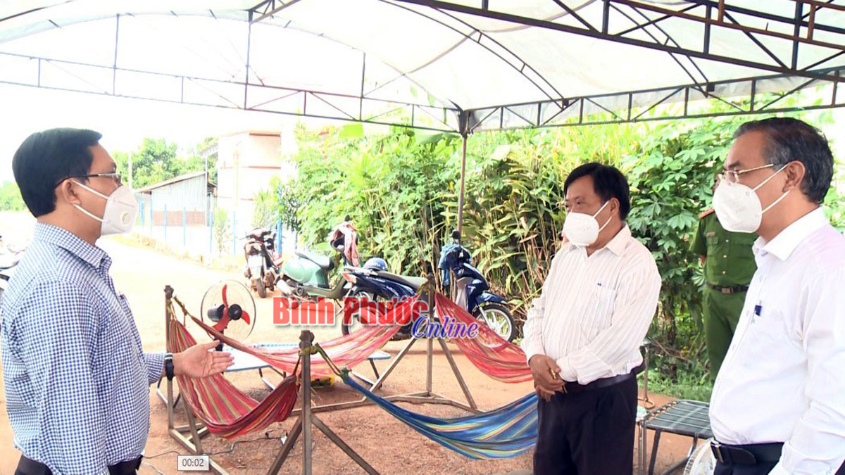 | Trưởng ban Tuyên giáo Tỉnh ủy Hà Anh Dũng trao đổi với lãnh đạo thị xã Phước Long về công tác phòng, chống dịch tại chốt kiểm soát (Ảnh: Báo Bình Phước) |