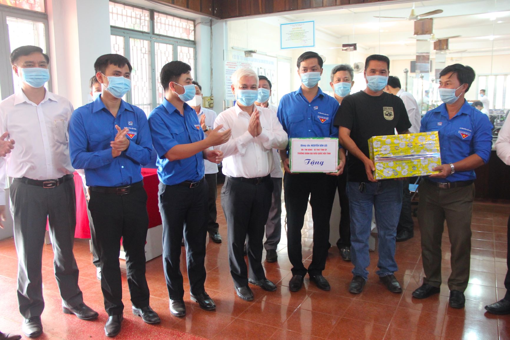 | Bí thư Tỉnh ủy Bình Phước Nguyễn Văn Lợi (hàng đầu, thứ tư, từ trái sang) và Tỉnh Đoàn - CLB Pickup Bình Phước tặng quà cho đội thanh niên tình nguyện trực hỗ trợ tại bộ phận một cửa huyện Lộc Ninh |