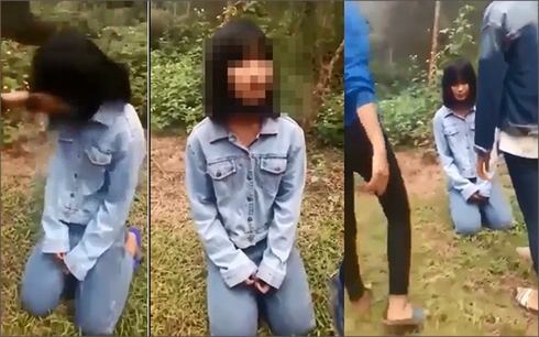 Nữ sinh ở Nghệ An bị bạn bắt quỳ gối và đánh (ảnh cắt từ clip)