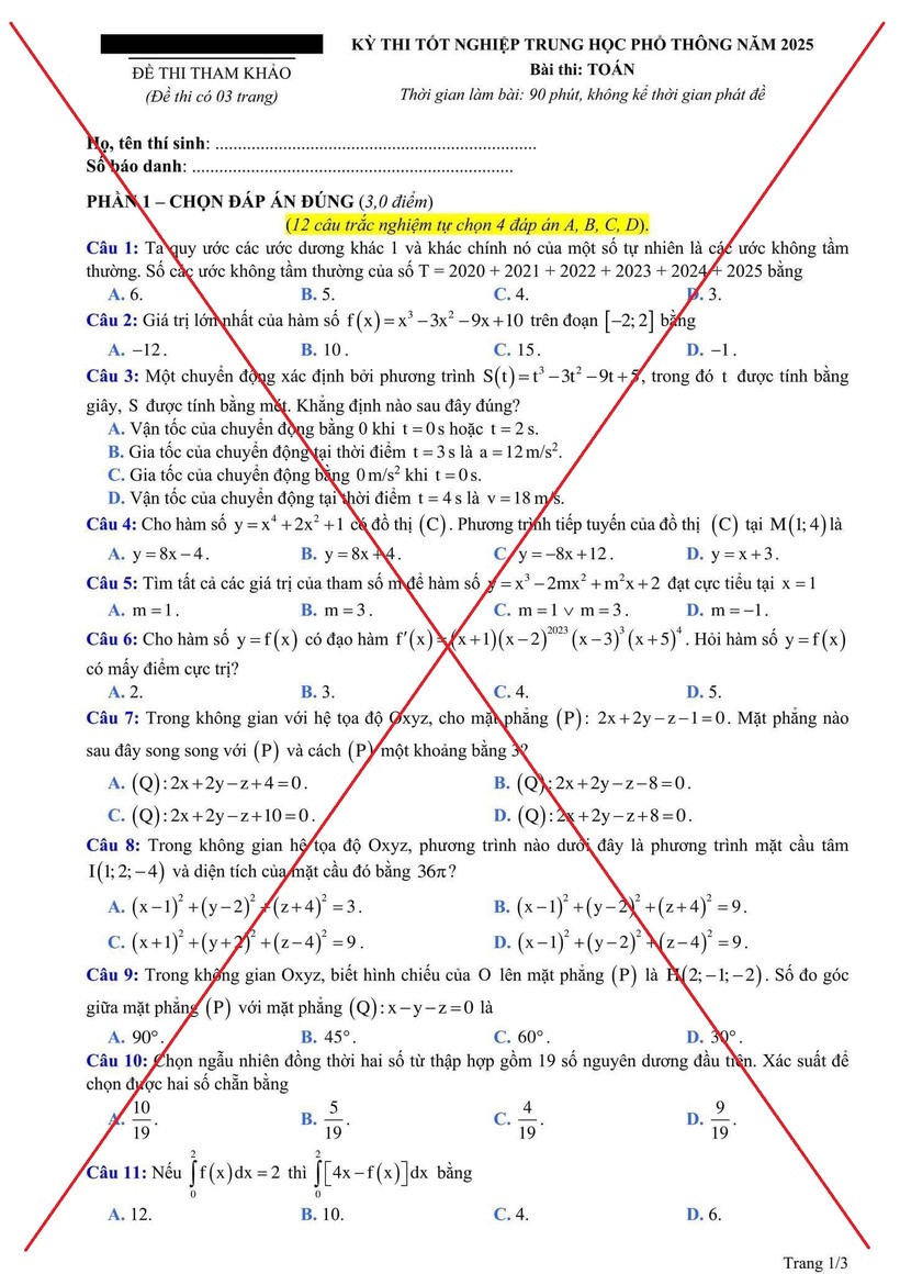 Theo thông báo này, hiện nay, trên mạng xã hội lan truyền một văn bản đề thi môn Toán được cho là Đề thi tham khảo Kỳ thi tốt nghiệp THPT năm 2025.