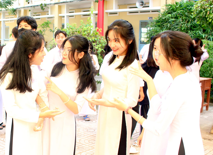 Học sinh Trường THPT Tiểu Cần phấn khởi gặp nhau ngày khai giảng. Ảnh: NGỌC XOÀN